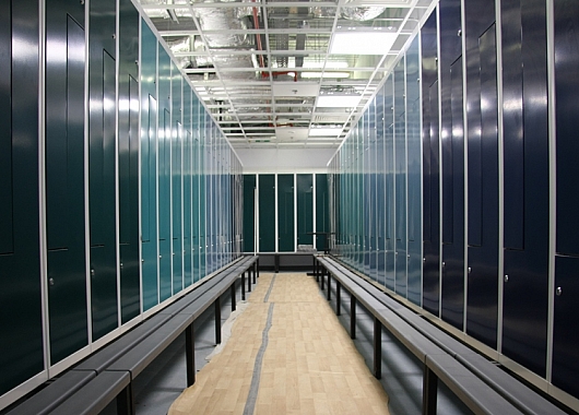 Стеллажи для склада сборные были поставлены в четырех различных цветов RAL, которые были выбраны клиентом. В обоих переодевания шкафчики монтируются на сиденьях & стендах и все шкафчики включают интегрированную наклонную верхнюю часть.